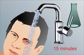 Chemical exposures: The single most important thing to do for chemical exposures is to perform first aid by immediately washing out the eye with large amounts of water. Although saline solution is best, regular tap water is a perfectly acceptable alternative. Particularly, for more serious burning materials, such as acid or alkali, time is of the essence. The affected eye should be washed for 20 minutes or more. It is important that people keep their eyelids open during the irrigation process; this may require the assistance of another person to help the patient keep their eye open during the wash out.