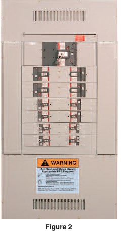 Panel boards, sometimes called distribution panel boards (DPB), or distribution boards are larger than a standard panel and may range from 400-1200A. They are typically standalone, but smaller units may be wall or beam mounted. Larger units may be accessible front and back side via bolted covers. For standard DPB’s, typical labeling procedures is one label on the main cover, top center. For the example shown in Figure-2, the label was moved to the bottom to prevent covering the cooling vents. Panel boards, do not have isolated and barrier protected main breakers unless specially ordered and should always have only one label.