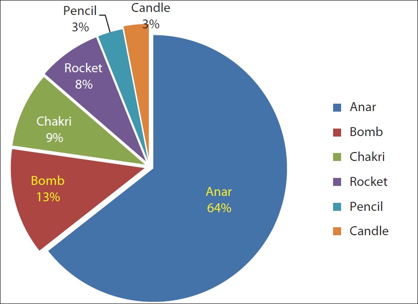 Being a retrospective study, the details of the mode of injury were not available in the records of majority of them. The detail of the firecrackers causing the injury was available for 230 patients. The Anar (flower pot) was found to be the most common causative agent, closely followed by Bombs (sound-emitting fireworks) [Figure 2].