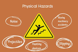 - physical - Slippery floors, objects in walkways, unsafe or misused machinery, excessive noise, poor lighting, fire. radiation, magnetic fields, pressure extremes (high pressure or vacuum), noise, etc.,