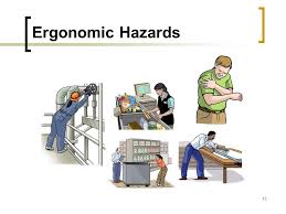 - ergonomic - repetitive movements, improper set up of workstation, poor design of equipment, workstation design, (postural) or workflow, manual handling, repetitive movement.etc.,