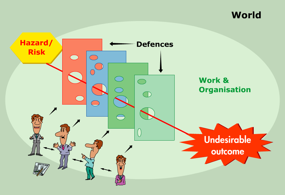 According to Reason, very few unsafe acts result in actual damage or injury. Various layers of defense can only be breached by the adverse conjunction of several different causal factors.