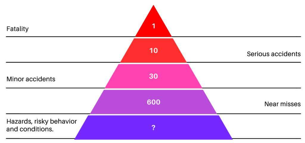 In 1966, Frank Bird analyzed the incident reports of over 300 companies — 1.7 million reports in total. He used his findings to expand Heinrich’s theory. Bird’s Safety Triangle looks deeper into the behaviors leading to potential accidents. In his book, Damage Control, he determined that for each fatality, a company will see: