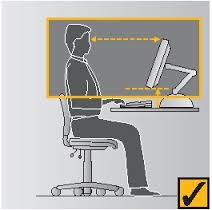 The key to comfort is in maintaining the body in a relaxed, natural position. The ideal work position is to have the arms hanging relaxed from the shoulders. If a keyboard is used, arms should be bent at right angles at the elbow, with the hands held in a straight line with forearms and elbows close to the body. The head should be in line with the body and slightly forward.
